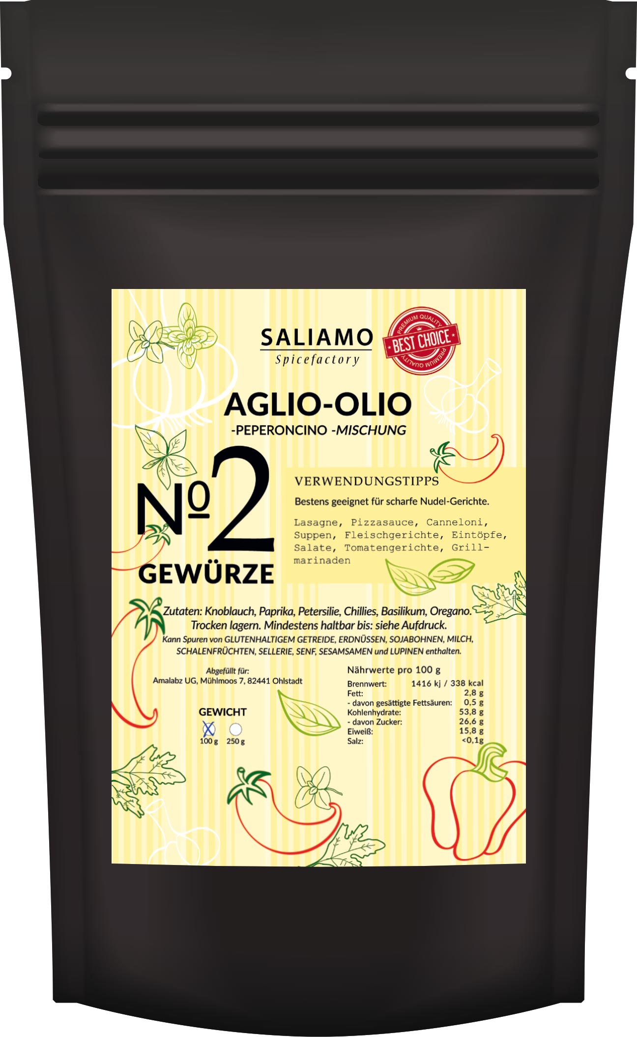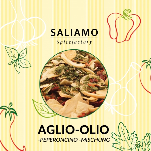 Aglio Olio e Peperoncino Gewürzmischung im praktischen wiederverschließbaren Aromaschutzbeutel.