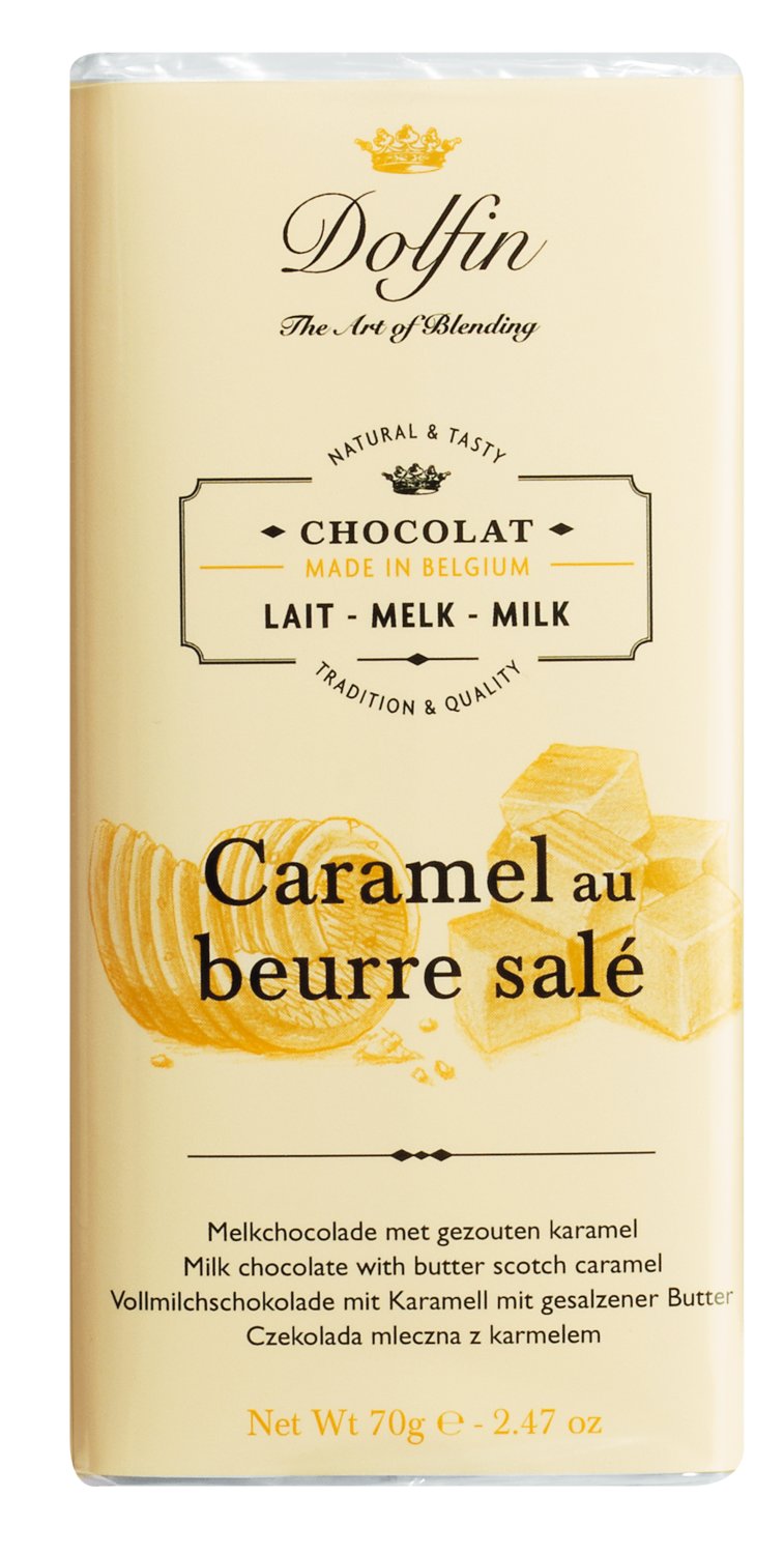 Ganz in französischer Tradition hat Dolfin diese neue Schokolade kreiert: mit Butterkaramell und Sel de Guerande. Die Vollmilchschokolade knuspert durch die Karamellstückchen angenehm im Mund und besitzt einen zarten Salzton.