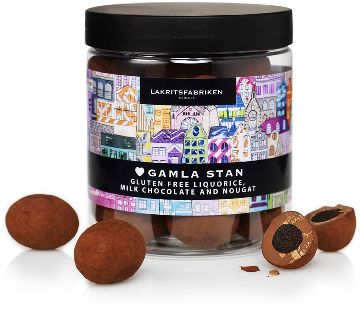 Salz-Lakritz mit Milchschokolade & Nougat | Gamla Stan gilt als die „Urzelle“ Stockholms und zählt mit seinen gepflasterten Straßen und Gebäuden aus dem 17. und 18. Jahrhundert zu den größten und besterhaltensten Stadtkernen Europas. Lakritsfabriken umhüllt hierfür einen salzigen Lakritzkern mit einer feinen Schicht aus Milchschokolade und Nougat.